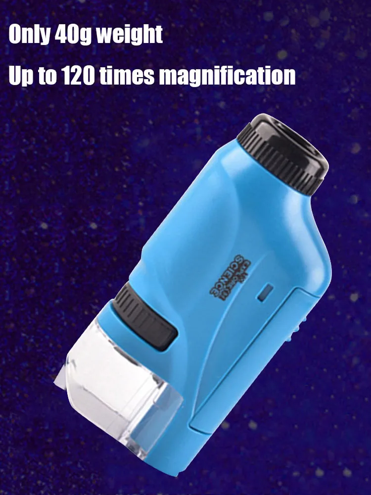 Handheld Pocket Microscope 60-120X Educational Science Microscope Battery Powered Biological Microscope Kit Outdoor Children Toy Features: 1. Compact Ergonomics: Tailored for Comfort. Our mini microscope kit, with a form factor designed to fit comfortably in children's hands, makes the experience of using a handheld microscope a delight. 2. Portable Power: Battery Convenience. Powering up for on-the-go discovery is simple with our handheld pocket microscope's requirement of 2 AAA batteries (not included), affording users the ability to replace power sources easily wherever their investigations may lead. 3. Enhanced Magnification: Multi-Zoom Capability. With support for 60X to 120X magnification levels, this educational science microscope allows for detailed observation of specimens, like onion cells, at various magnifications to meet different educational needs. 4. Illumination Included: Gentle LED Light. Our biological microscope kit comes equipped with its own gentle, eye-friendly LED light source that can be adjusted to illuminate specimens. 5. Smartphone Compatible: Photo Capture. This portable mini microscope isn't just a tool for observation-it can connect to a smartphone, transforming it into a powerful device to capture images of the microscopic world.